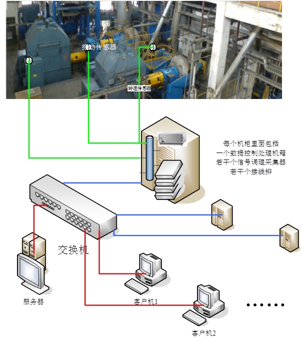 “大型生產線在線監測及故障分析系統”利用傳感器檢測、信號處理、計算機技術、數據通訊技術和旋轉機械的故障診斷相關技術,由振動加速度傳感器、智能信號調理采集器、嵌入式信號采集與服務平臺等硬件,以及信號采集程序、網絡服務器程序和振動監測與故障分析客戶端程序等軟件兩部分組成。這主要考慮到咱們設備的重要性、分散性和測點數量的規模性。