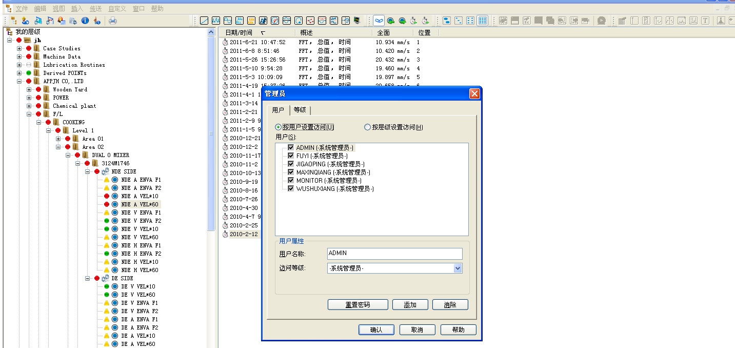 本系統采取C/S模式,在服務器端運行數據庫SQL Server,嵌入式采集平臺上運行采集程序,在局域網上任意一臺計算機上安裝客戶端程序,登錄用戶名和密碼可以訪問任意子系統。 系統采集軟件可以任意設置所有振動測點名、測點參數、采樣時間、采樣頻率、采樣長度、傳感器類型、傳感器靈敏度、控制開閉、地址設置等。具有當今國際經典監測與診斷軟件的風格和功能。