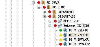 具體設備以樹狀列表形式顯示,樹狀列表由用戶根據設備情況確定層次數,每個節點用兩個圖標分別顯示報警狀態和設備屬性(用不同的圖標表示設備組、軸承、齒輪、溫度、轉速等),設備組或具體設備屬性以多頁窗口形式輸入數據庫,需輸入漢字的編輯框自動打開該操作員指定的漢字輸入法。點擊某設備圖標,右邊出該點采集數據包、設備圖像。 樹狀列表參考下圖: