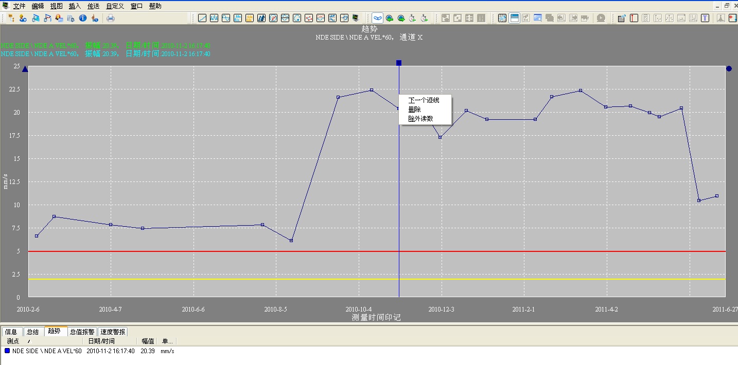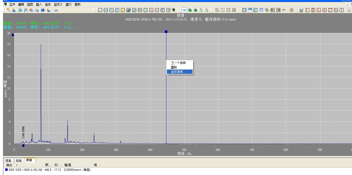 2)頻譜圖:Y軸單位可選:m/s2、um、mm/s,指標計算方法可選:峰值、峰峰值、均方根值,由用戶在頻域圖點鼠標右鍵選擇。頻譜圖上可以選擇疊加另一次的頻譜。