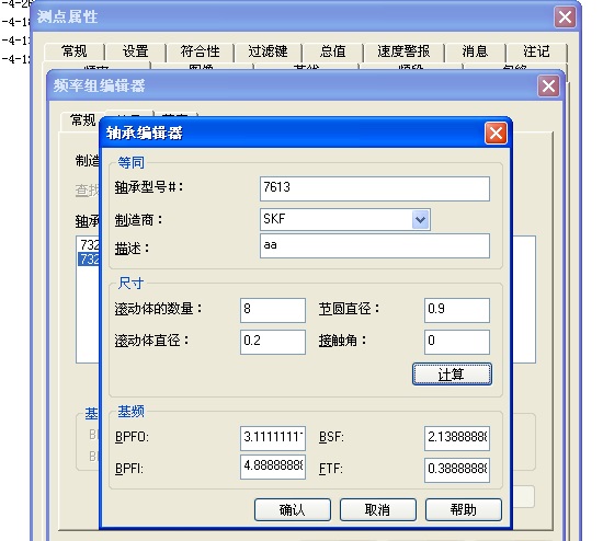 機器節點屬性的“頻率”屬性是由用戶選擇特征頻率組,如:軸承型號,若系統沒有該軸承,由用戶添加。如下圖: