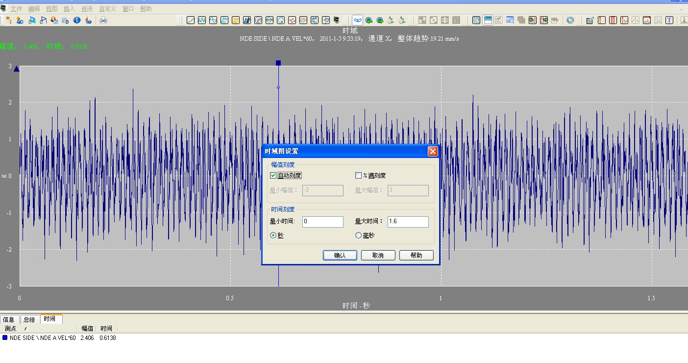 頻率:軸承各固有頻率; 圖像:設備照片及其上安裝的傳感器; 頻段:設置各頻段速度幅值的報警值; 包絡:設置各頻段加速度包絡幅值的報警值; 消息:歷史報警記錄; 注記:設備病歷卡; ● 數據算法模塊具有以下功能: 1)對原始數據進行FFT變換; 2)計算加速度包絡等; ● 圖形分析模塊具有以下功能: 系統能展示以下四種圖形: 1)時域圖:圖形縱坐標自動按數據峰值調整,使圖形顯示在坐標系中間部位。圖形要能放大、縮小,可以選擇查看某個數據包,圖形能疊加單一光標、周期光標等分析工具,光標移動到那里,信息窗顯示該點相應數據;