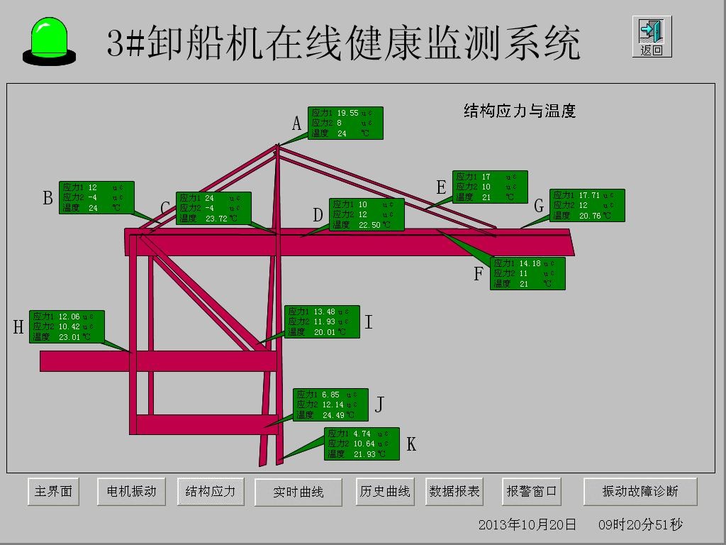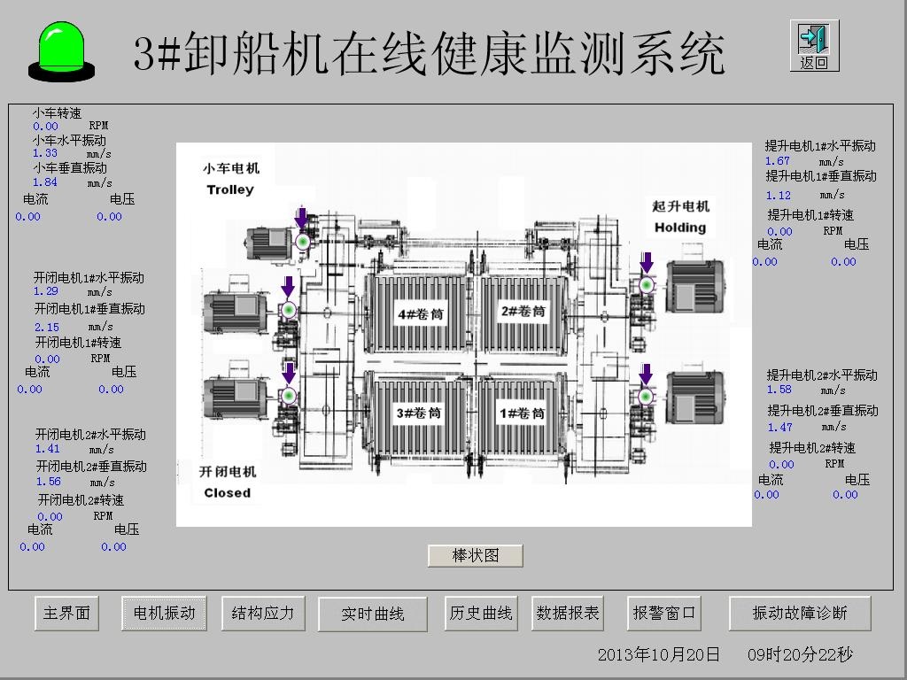 | 港機安全在線監測與故障診斷系統 針對港口卸船機的特性,北京萬博振通檢測技術有限公司開發了《港機安全在線監測與故障診斷系統》。對于重要設備減速箱采用實時振動數據采集、并實時健康評估、精密故障診斷,可以定時采集振動波形信號。根據當時轉速和機械結構提取特征故障頻率直接提示給用戶。該系統還監測其他物理量包括電流、電壓、轉速、溫度、應力等。具有如下特點: 1、4G或5G無線路由隨時可查看 2、具有專業振動故障診斷功能 3、門限報警、歷史數據查詢 4、與控制系統PLC數據共享 北京萬博振通檢測技術有限公司專注振動30年,提供狀態監測與故障診斷全面解決方案。